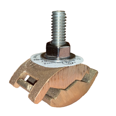 Parallel Lightning Protection splicer (for secondary use only) with single carriage bolt and 1” of surface contact. Splicer can be used with all secondary to main size lightning conductor. 1/2″ wrench needed. Suitable for direct burial in earth and concrete. UL Listed 96, UL Listed 467.